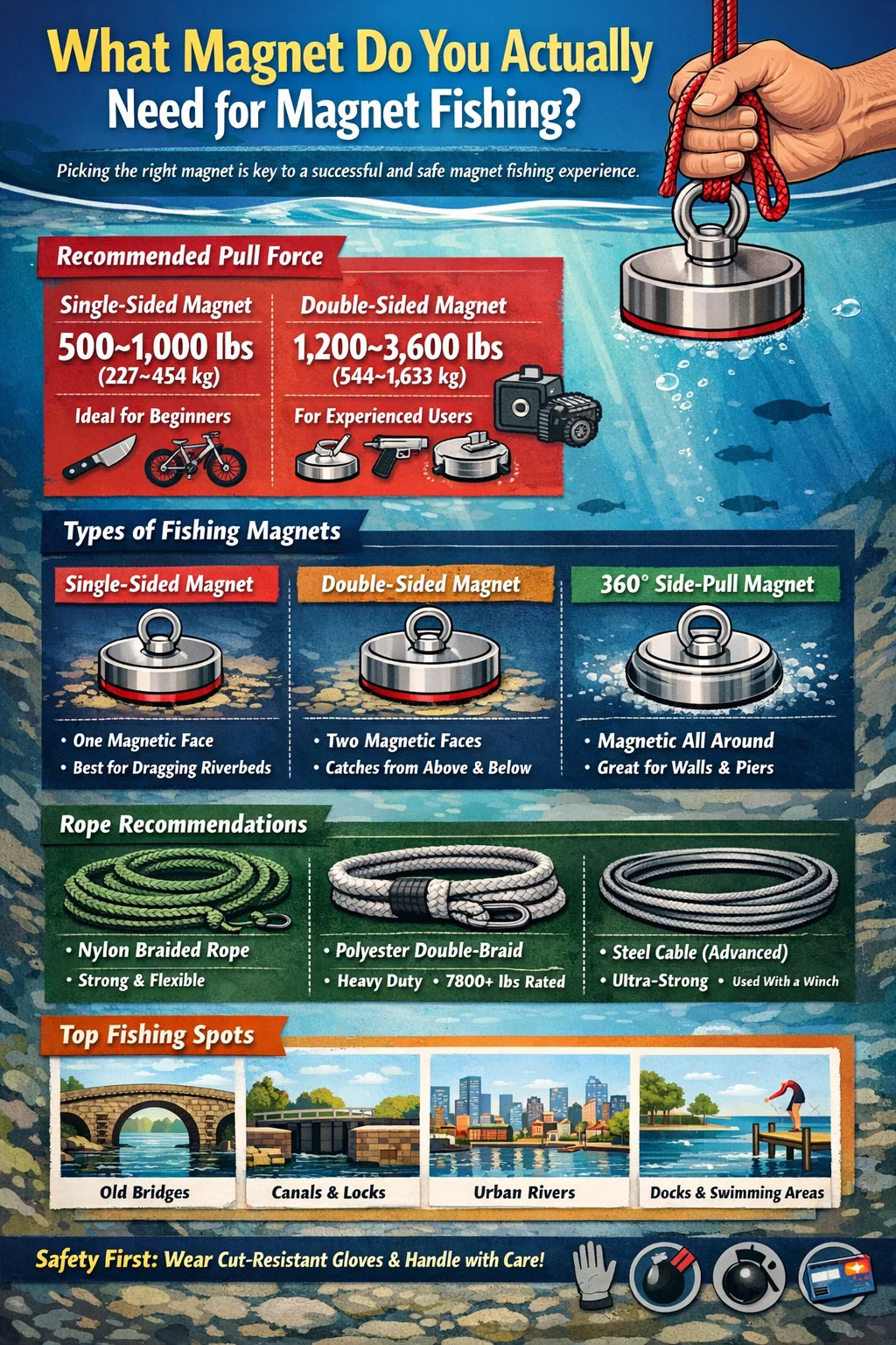 Jawaban singkatnya: bagi kebanyakan pemula, a magnet neodymium satu sisi dengan gaya tarik 500–1.000 lbs (227–454 kg) adalah titik awal yang ideal untuk memancing dengan magnet. Ia cukup kuat untuk mengambil pisau, peralatan, sepeda, dan bahkan brankas dari sungai dan danau, namun cukup mudah untuk ditangani dengan aman tanpa peralatan khusus. Jika Anda lebih berpengalaman atau menargetkan objek yang lebih berat di perairan dalam, magnet dua sisi dengan kisaran 1.200–3.600 pon menjadi pilihan yang lebih baik.