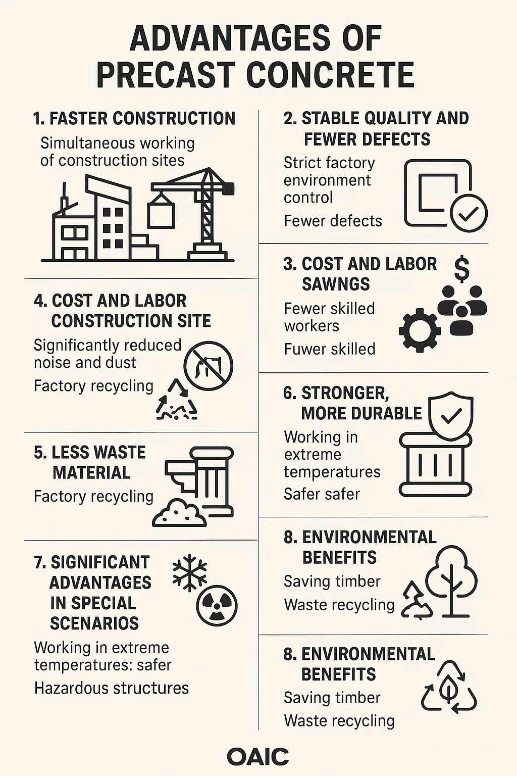 Perakitan di lokasi seperti blok bangunan: Beton pracetak langsung diangkat ke lokasi, sehingga menghemat waktu yang dihabiskan untuk bekisting, pengikatan tulangan, dan menunggu beton mengeras.
