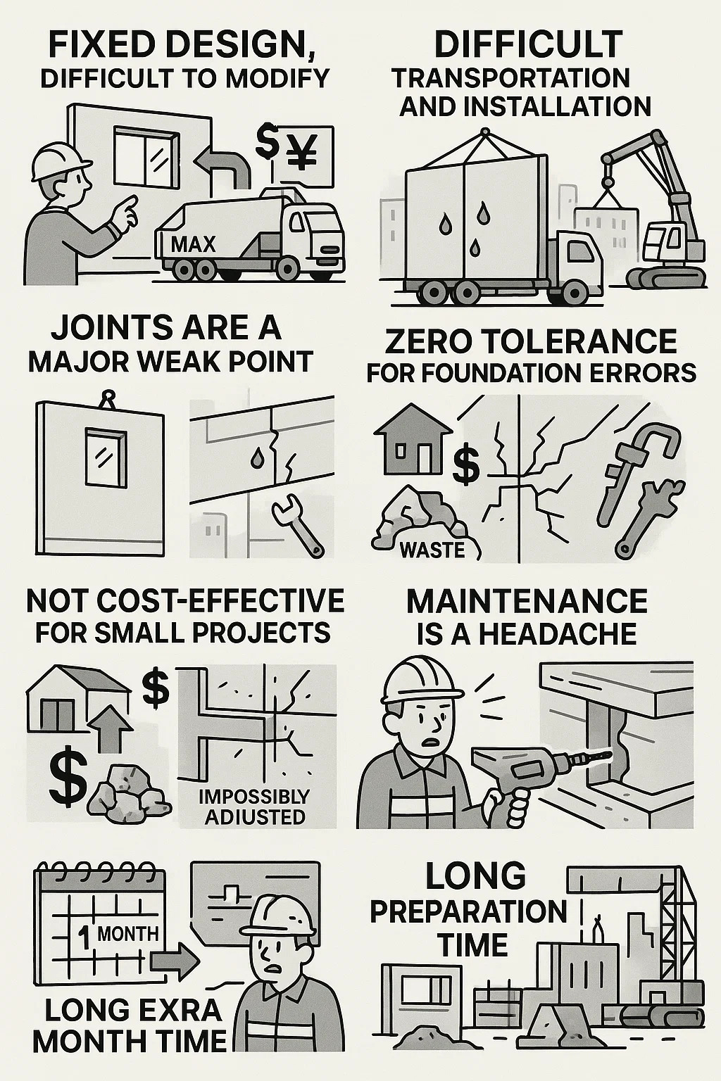 Siklus desain yang panjang: Semua detail harus diselesaikan sebelum konstruksi dimulai, dan gambar harus diperiksa berulang kali, memerlukan waktu satu bulan ekstra dibandingkan dengan konstruksi cor di tempat.
