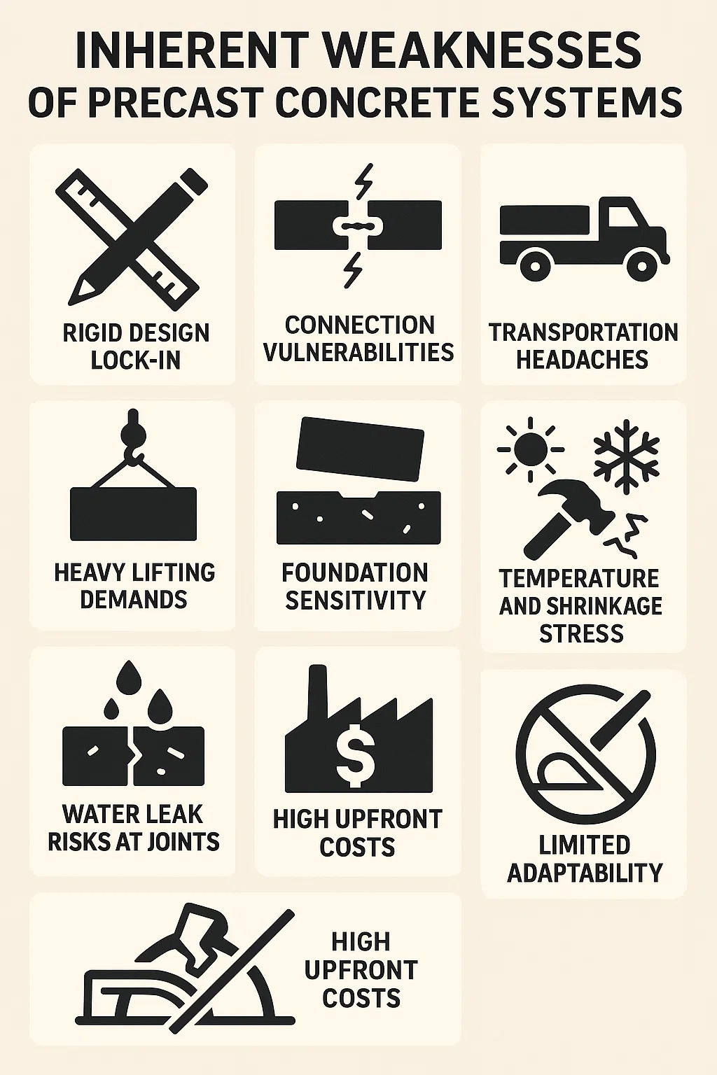 Jika pondasi tidak rata sempurna atau jangkarnya terlepas sedikit saja, potongan pracetak tidak akan muat. Memperbaiki hal ini berarti penyesuaian yang mahal atau penyusunan ulang komponen.