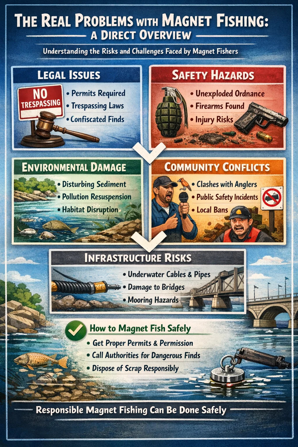 Masalah yang terkait dengan penangkapan ikan dengan magnet adalah nyata namun dapat diatasi. Para penghobi yang mengalami masalah serius sebagian besar adalah mereka yang tidak mempersiapkan diri dengan baik sebelum keluar. Praktik-praktik berikut ini menangani kategori risiko utama secara langsung.